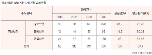Áß±âû R&D Áö¿ø »ç¾÷¿¡ ½ÅûÇÑ °úÁ¦ Áß Á¤º¸º¸È£ °ü·Ã °úÁ¦¸¦ µÎ °¡Áö ±â¼ú ºÐ¾ßº°·Î ºÐ¼®ÇÑ °á°ú, Á¤º¸º¸¾È(61.2%), À¶ÇÕº¸¾È(23.0%), ¹°¸®º¸¾È(15.9%) ¼øÀ¸·Î Áß¼Ò±â¾÷ÀÌ ±â¼ú °³¹ß¿¡ °ü½ÉÀ» º¸ÀÌ´Â °ÍÀ¸·Î ºÐ¼®µÆ´Ù. ÁÖ¿ä ǰ¸ñº° ±â¼ú °³¹ß °úÁ¦ Áõ°¡ Ãß¼¼¸¦ »ìÆìº¸¸é ¹°¸®º¸¾È ºÐ¾ßÀÇ Áõ°¡À²ÀÌ °¡Àå ³ô°Ô ³ªÅ¸³µÀ¸¸ç, À¶ÇÕº¸¾È, Á¤º¸º¸¾È ¼øÀ¸·Î ±â¼ú °³¹ßÀÌ Áõ°¡Çϰí ÀÖ¾ú´Ù. ÁÖ¿ä ±â¼ú ºÐ¾ßº° ½Åû °úÁ¦¿¡ ´ëÇÑ ³»¿ëÀ» ºÐ¼®ÇØ ºÐ¾ßº°·Î Áß¼Ò±â¾÷ÀÌ °ü½ÉÀ» °®´Â Á¦Ç°À» ÆÄ¾ÇÇØº¸´Ï Á¤º¸º¸¾È ºÐ¾ß¿¡¼´Â Ŭ¶ó¿ìµå¿Í ½º¸¶Æ®¿öÅ© ȯ°æ, ¸ð¹ÙÀÏ º¸¾È±â¼úÀ» ÅëÇÑ °³ÀÎÁ¤º¸ À¯Ãâ ¿øÃµ Â÷´Ü, Áß¼Ò±â¾÷ÀÇ Á¤º¸º¸È£ °ü¸® ü°è µî¿¡ ´ëÇÑ ¼ö¿ä°¡ ³ôÀº °ÍÀ¸·Î ³ªÅ¸³µÀ¸¸ç, À¶ÇÕº¸¾È ºÐ¾ß´Â Ãʱ¤°¢ Àû¿Ü¼± CCTV ¹× ÀÎüÀÎ½Ä ÆÐÅÏ ºÐ¼®, ¹ÙÀÌ¿ÀÀÎ½Ä ±â¼ú ±â¹Ý À¥·¸ð¹ÙÀÏ, »ç¹°ÀÎÅͳÝ(IoT) °ü°è¸Á¿¡¼ÀÇ º¸¾È°ú ¹æ¹ý µî¿¡ ´ëÇÑ ¼ö¿ä°¡ ³ôÀº °ÍÀ¸·Î µå·¯³µ´Ù.