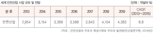 ¼¼°è ¾ÈÀü»ê¾÷ ½ÃÀåÀÌ ²ÙÁØÇÑ ¼ºÀå¼¼¸¦ º¸ÀδÙ. 2013³â 2,954¾ï´Þ·¯¿´´ø ½ÃÀå ±Ô¸ð´Â 2019³â 4,383¾ï´Þ·¯·Î ¿¹»óµÈ´Ù. Àüü ¾ÈÀü»ê¾÷ÀÇ ±Ô¸ð´Â ¾ÈÀü Àåºñ¿Í ¾ÈÀü ¼ºñ½ºÀÇ ±Ô¸ð¸¦ ÇÕÇÑ ÃѾ×ÀÌ´Ù. 2011³â 829¾ï´Þ·¯ ¼öÁØÀ̾ú´ø ¾ÈÀüÀåºñ ½ÃÀåÀº 2021³â±îÁö ¿¬Æò±Õ 6.6%¾¿ ¼ºÀåÇØ 1,570¾ï´Þ·¯ ¼öÁØ¿¡ À̸¦ °ÍÀ¸·Î ¿¹»óµÈ´Ù.