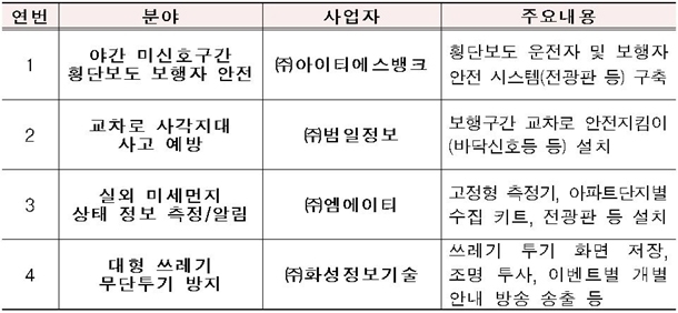 ¼±Á¤µÈ ¹Î°£¾÷ü´Â 4¿ùºÎÅÍ 10¿ù±îÁö ±³Åë¾ÈÀü, »ýȰȯ°æ °³¼± µî°ú °ü·ÃµÈ Ⱦ´Üº¸µµ ¾ÈÀü½Ã½ºÅÛ ±¸Ãà, ¹Ì¼¼¸ÕÁöÃøÁ¤±â ¼³Ä¡ µîÀÇ »ç¾÷À» ÃßÁøÇÒ °èȹÀÌ´Ù.