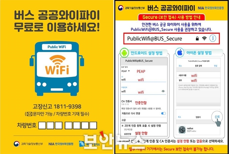 º¸¾ÈÀÌ °ÈµÇ°í ¼Óµµµµ ºü¸¥ °íǰÁúÀÇ °ø°ø¿ÍÀÌÆÄÀÌ ¼ºñ½º¸¦ ÀÌ¿ëÇÏ°í ½ÍÀº ÀÌ¿ëÀÚµéÀº ¡®PublicWiFi@Bus_Secure_¡Û¡Û¡Û¡Û¡¯¿¡ Á¢¼ÓÇÏ¸é µÈ´Ù. ´Ù¸¸ ´©±¸³ª Á¢¼Ó °¡´ÉÇÑ °ø°ø¿ÍÀÌÆÄÀÌ ¼ºñ½ºÀÇ Æ¯¼º»ó °ÈµÈ º¸¾È ±â¼úÀÌ Àû¿ëµÅ ÀÖ´õ¶óµµ ¹Î°¨ÇÑ °³ÀÎÁ¤º¸ ÀÔ·ÂÀ̳ª ±ÝÀ¶ °Å·¡´Â ÇÇÇÒ °ÍÀ» ±ÇÀåÇÑ´Ù.