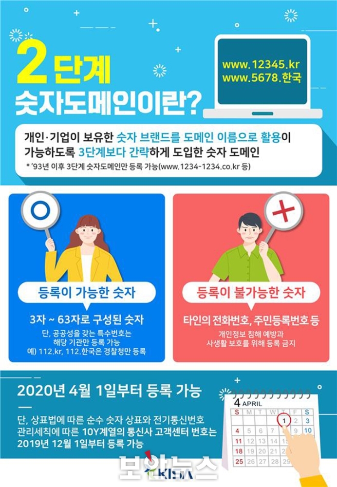 2´Ü°è ¼ýÀÚµµ¸ÞÀÎÀº µµ¸ÞÀεî·Ï°ü¸®½Ã½ºÅÛ °³¼± µîÀ» °í·ÁÇØ 2020³â 4¿ù 1ÀϺÎÅÍ º»°ÝÀûÀ¸·Î µî·ÏÀÌ °³½ÃµÈ´Ù. ¡®µî·Ï °¡´É ¼ýÀÚ¡¯´Â ¼ýÀÚ[0~9], ÇÏÀÌÆù[-] Á¶ÇÕÀ¸·Î 3~63ÀÚ ¹üÀ§ ³»¿¡¼ µî·ÏÀÌ °¡´ÉÇÏ´Ù. ´Ù¸¸ ¡®Àü±âÅë½Å¹øÈ£°ü¸®¼¼Ä¢¡¯ÀÇ Æ¯¼ö¹øÈ£ Áß 11Y(115 Á¦¿Ü), 12Y, 13YY °è¿ ¹× 107, 182, 188 ¹øÈ£´Â ±¹¹Î È¥¶õ ¹æÁö¡¤°ø°øÁú¼ À¯Áö µîÀ» À§ÇØ ÇØ´ç °ø°ø±â°ü¸¸ µî·ÏÀÌ Çã¿ëµÇ¹Ç·Î °³ÀÎÀº µî·ÏÇÒ ¼ö ¾ø´Ù.