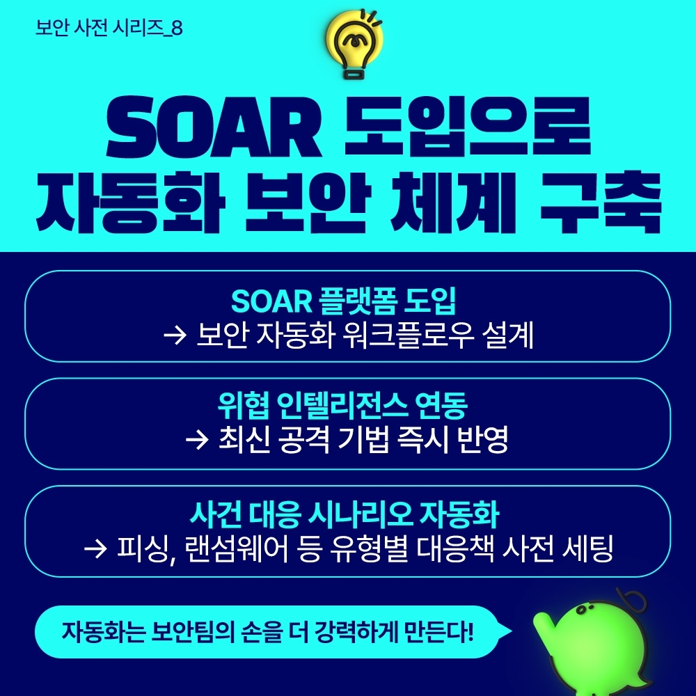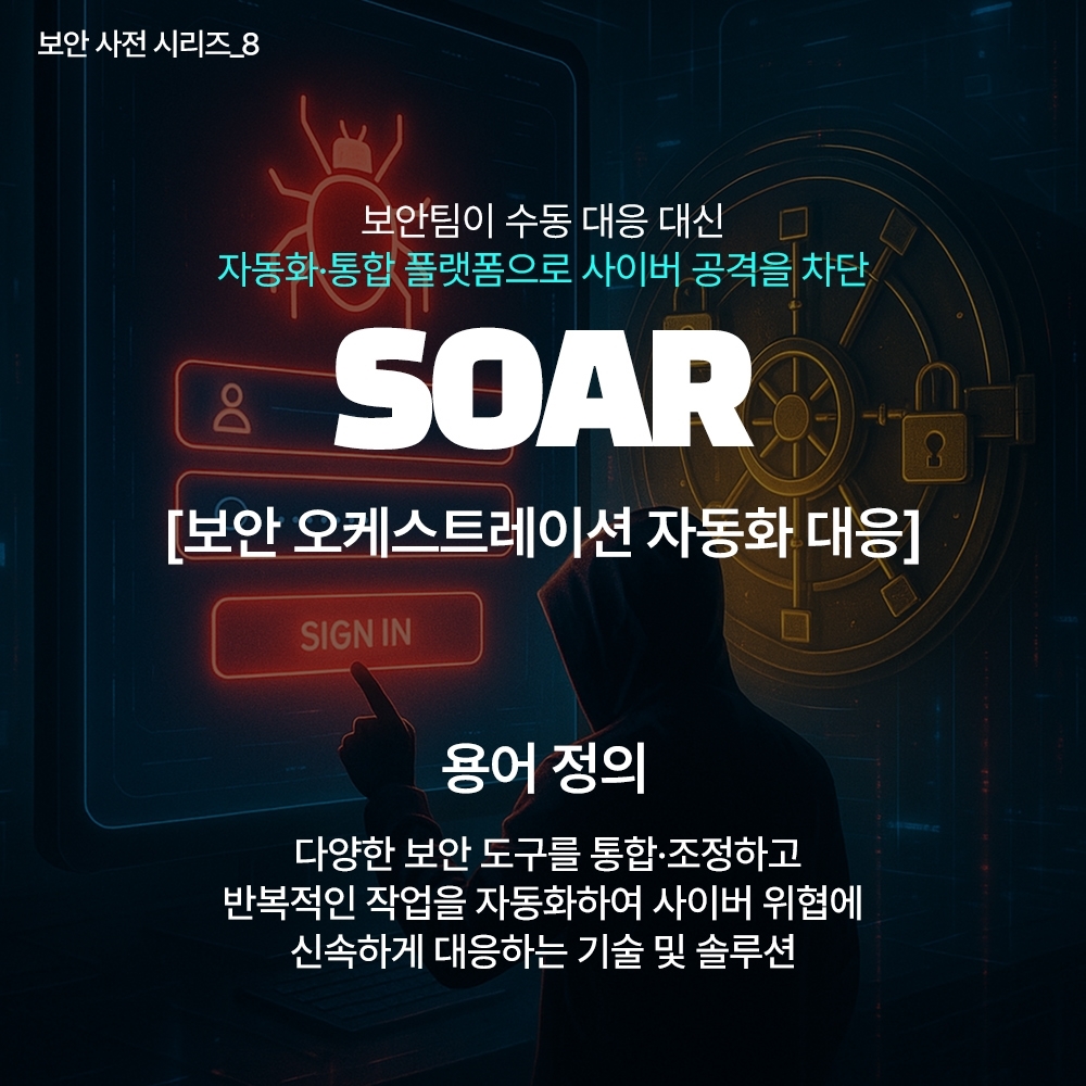 SOAR(Security Orchestration, Automation and Response)´Â »çÀ̹ö À§Çù ´ëÀÀÀ» ÀÚµ¿ÈÇÏ´Â º¸¾È ±â¼úÀÌ´Ù.