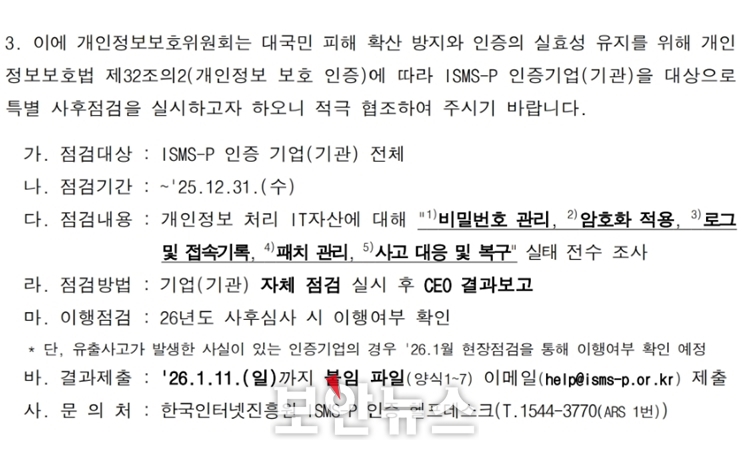 ÀÌ¿¡ ¡°À§¿øÈ¸´Â °³ÀÎÁ¤º¸º¸È£¹ý»ó ÀÎÁõ±â°üÀÇ °ü¸®¡¤°¨µ¶ ±â°ü¡±ÀÓÀ» ºÐ¸íÈ÷ Çϰí, ¡°Ãß°¡ÀûÀÎ °³ÀÎÁ¤º¸ ÇÇÇØ È®»ê ¹æÁö ¹× ÀÎÁõÁ¦µµ ½Å·Ú À¯Áö¸¦ À§ÇØ¡± ISMS-P ÀÎÁõ ±â¾÷ Àüü¸¦ ´ë»óÀ¸·Î Ưº° »çÈÄÁ¡°ËÀ» ½Ç½ÃÇÑ´Ù°í ¹àÇû´Ù.