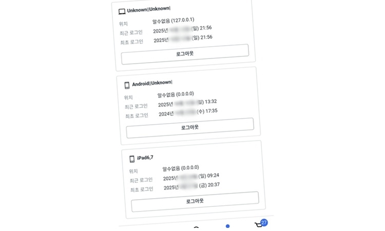 ¿©±â¼ ÇöÀç ·Î±×ÀÎµÈ ±â±â ¸ñ·Ï°ú °ú°Å ·Î±×ÀÎ ±â·ÏÀ» È®ÀÎÇÒ ¼ö ÀÖ´Ù. ·Î±×ÀÎ ±â·Ï¿¡¼± Á¢¼Ó ±â±â¿Í IP ÁÖ¼Ò, Á¢¼Ó ½Ã°£ µîÀ» »ó¼¼È÷ È®ÀÎÇÒ ¼ö ÀÖ´Ù. »ç¿ëÇÏÁö ¾ÊÀº ±â±â³ª ¹æ¹®ÇÏÁö ¾ÊÀº Áö¿ª IP ÁÖ¼Ò°¡ È®Àεȴٸé Áï½Ã ¡®·Î±×¾Æ¿ô¡¯ Á¶Ä¡µµ ÁøÇàÇÒ ¼ö ÀÖ´Ù.