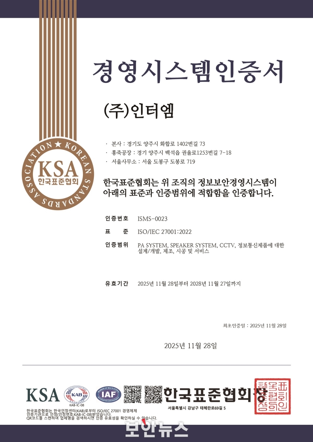 ÀÎÅÍ¿¥ °ü°èÀÚ´Â ¡°ISO/IEC 27001 ÀÎÁõÀº ´Ü¼øÇÑ Çü½ÄÀÌ ¾Æ´Ï¶ó º¸¾È Á¤Ã¥¿¡¼ ¿î¿µ¡¤°³¼±±îÁö Àü °úÁ¤ÀÌ ±¹Á¦ Ç¥ÁØ¿¡ ÀûÇÕÇÏ´Ù´Â Á¡À» ÀÎÁ¤¹ÞÀº °á°ú¡±¶ó¸ç ¡°Á¦Á¶±â¾÷¿¡¼´Â ÈçÈ÷ º¸À¯ÇÏÁö ¾Ê´Â ÀÎÁõÀ̱⠶§¹®¿¡ ´õ¿í Àǹ̰¡ Å©´Ù. ¾ÕÀ¸·Îµµ º¸¾ÈÀ» ±â¾÷ °æ¿µÀÇ ÇÙ½É °¡Ä¡·Î »ï°í, °í°´¿¡°Ô ½Å·ÚÇÒ ¼ö ÀÖ´Â ¼ºñ½º¸¦ Á¦°øÇϰڴ١±°í ¸»Çß´Ù.