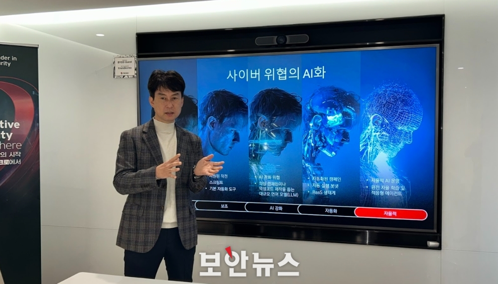 ±èÁø±¤ Æ®·»µå¸¶ÀÌÅ©·Î Çѱ¹Áö»çÀåÀº ¡°AI ½Ã´ëÀÇ »çÀ̹ö À§ÇùÀº ´ÜÆíÀû Æ÷ÀÎÆ® ¼Ö·ç¼ÇµéÀÇ Á¶ÇÕ¸¸À¸·Î´Â ´ëÀÀ ¼Óµµ¸¦ µû¶óÀâÀ» ¼ö ¾ø´Ù¡±¸ç ¡°ÀÌ¹Ì AI¸¦ ÅëÇØ °ø°ÝÀ» »ê¾÷È­, ÀÚµ¿È­Çϰí ÀÖ´Â °ø°ÝÀÚ¿¡ ¸Â¼­±â À§Çؼ± º¸¾È ¿ª½Ã Ç÷§Æû ±â¹ÝÀ¸·Î ÅëÇյǰí AI·Î ¹«ÀåÇØ¾ß ÇÑ´Ù¡±°í °­Á¶Çß´Ù.