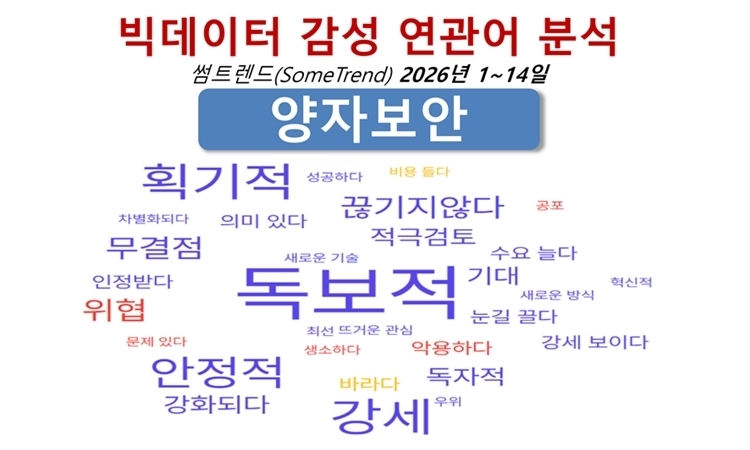 ºòµ¥ÀÌÅÍ ½ÉÃþ ºÐ¼® µµ±¸ÀÎ ½æÆ®·»µå(SomeTrend)·Î Áö³ 1¿ù 1ÀϺÎÅÍ 14ÀϱîÁö ¾çÀÚº¸¾È¿¡ ´ëÇÑ ºòµ¥ÀÌÅÍ °¨¼º ¿¬°ü¾î¸¦ µµÃâÇßÀ» ¶§µµ ±×·± È帧ÀÌ ¸íÈ®ÇÏ°Ô µå·¯³µ´Ù. ºÐ¼®¿¡¼ °¡Àå Çٽɿ¡ À§Ä¡ÇÑ ´Ü¾î´Â ¡®µ¶º¸Àû¡¯À̶ó´Â ¼¼ ±ÛÀÚ´Ù. ±× ÁÖº¯À¸·Î ¡®°¼¼¡¯, ¡®¾ÈÁ¤Àû¡¯, ¡®¹«°áÁ¡¡¯, ¡®±â´ë¡¯, ¡®°ÈµÈ´Ù¡¯¿Í °°Àº Ç¥ÇöÀÌ ¹ÐÁýµÅ ÀÖ´Ù.