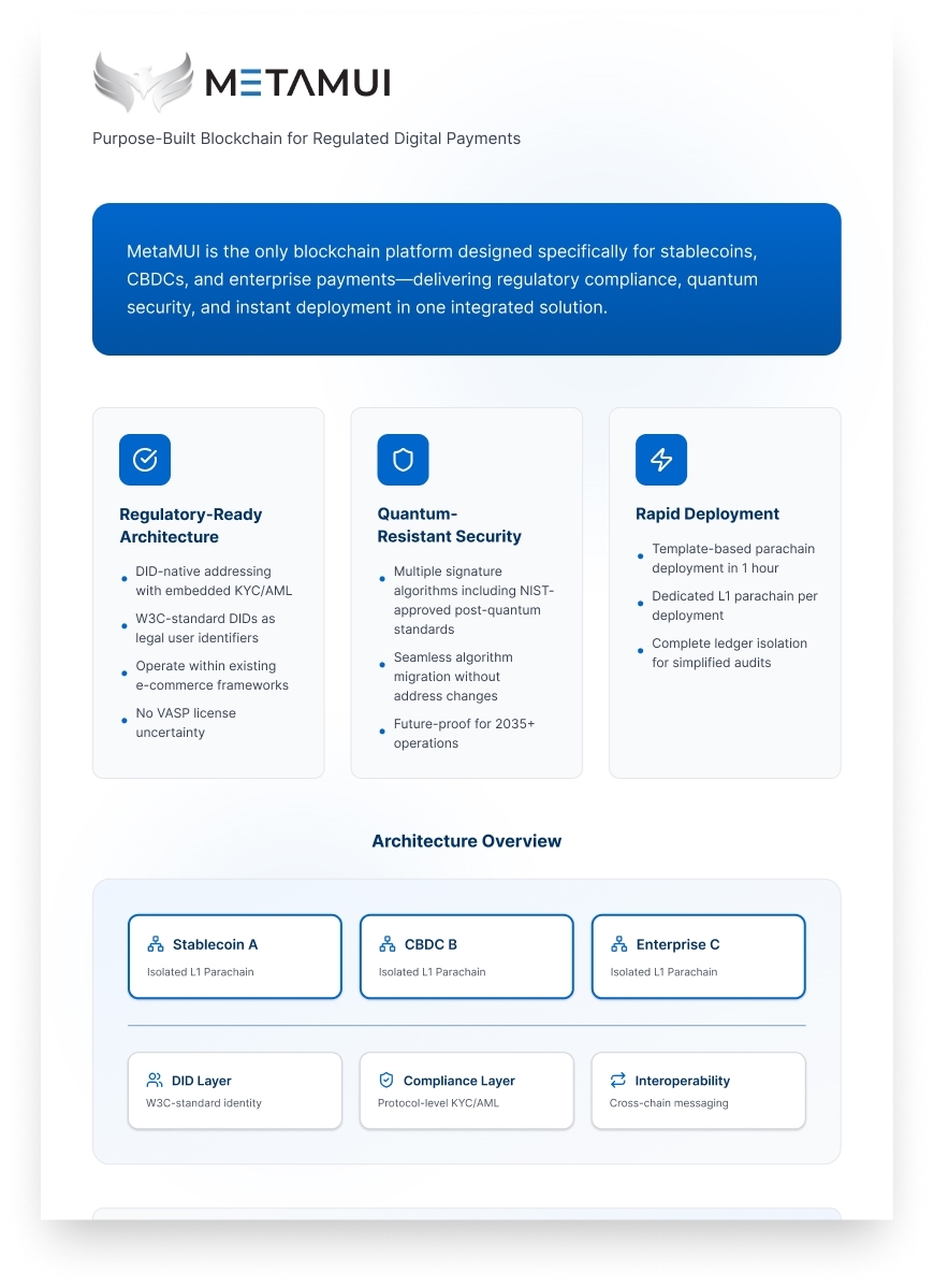 ¸ÞŸ¹«ÀÌ´Â ½ºÅ×À̺íÄÚÀΡ¤CBDC¡¤±â¾÷¿ë °áÁ¦ ½Ã½ºÅÛ¿¡ ƯȭµÈ ºí·ÏüÀÎ ¸ÞÀÎ³Ý Ç÷§ÆûÀ¸·Î, ±âÁ¸ ½º¸¶Æ® ÄÁÆ®·¢Æ® Ç÷§Æû°ú ´Þ¸® ¹èÆ÷¸¶´Ù Àü¿ë L1 ÆÄ¶óüÀÎÀ» Á¦°øÇØ ¿ÏÀüÇÑ ¿øÀå °Ý¸®¸¦ º¸ÀåÇÑ´Ù.