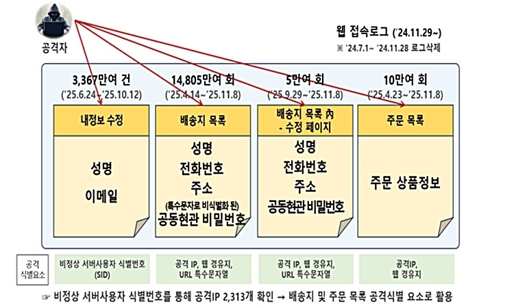 ¹Î°¨ÇÑ »ýȰ Á¤º¸µµ ´Ù¼ö Æ÷ÇԵƴÙ. °ø°ÝÀÚ´Â ¹è¼ÛÁö ¸ñ·Ï ÆäÀÌÁö¸¦ 1¾ï4805¸¸ ȸ ÀÌ»ó Á¶È¸Çߴµ¥, º»ÀλӸ¸ ¾Æ´Ï¶ó °¡Á·¡¤ÁöÀÎÀÇ ¼º¸í, ÀüÈ­¹øÈ£, ÁÖ¼Ò°¡ Æ÷ÇԵƴÙ. °Ô´Ù°¡ 5¸¸¿©È¸ Á¶È¸µÈ ¡®¹è¼ÛÁö ¸ñ·Ï ¼öÁ¤ ÆäÀÌÁö¡¯¿¡¼­´Â °øµ¿Çö°ü ºñ¹Ð¹øÈ£±îÁö Æò¹®À¸·Î ³ëÃâµÈ °ÍÀ¸·Î µå·¯³ª 2Â÷ ÇÇÇØ°¡ ¿ì·ÁµÈ´Ù.