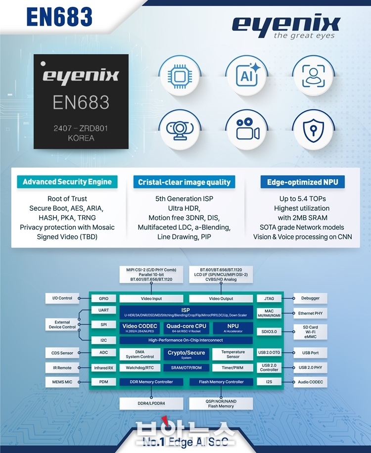 2003³â ¼³¸³ ÀÌÈÄ RISC V ¸ÖƼÄÚ¾î ÇÁ·Î¼¼¼­¿Í AI NPU¸¦ °áÇÕÇÑ EN675, EN683 ½Ã¸®Á ÅëÇØ ÃÖ´ë 5.4TOPS AI ¿¬»ê, °í¼º´É ISP, ¹ßÀüµÈ HDR, 2D/3D ³ëÀÌÁî Á¦°Å, ½Ç½Ã°£ °íÇØ»óµµ ¿µ»ó ó¸® ±â¼úÀ» ±¸ÇöÇØ ¿Ô´Ù.