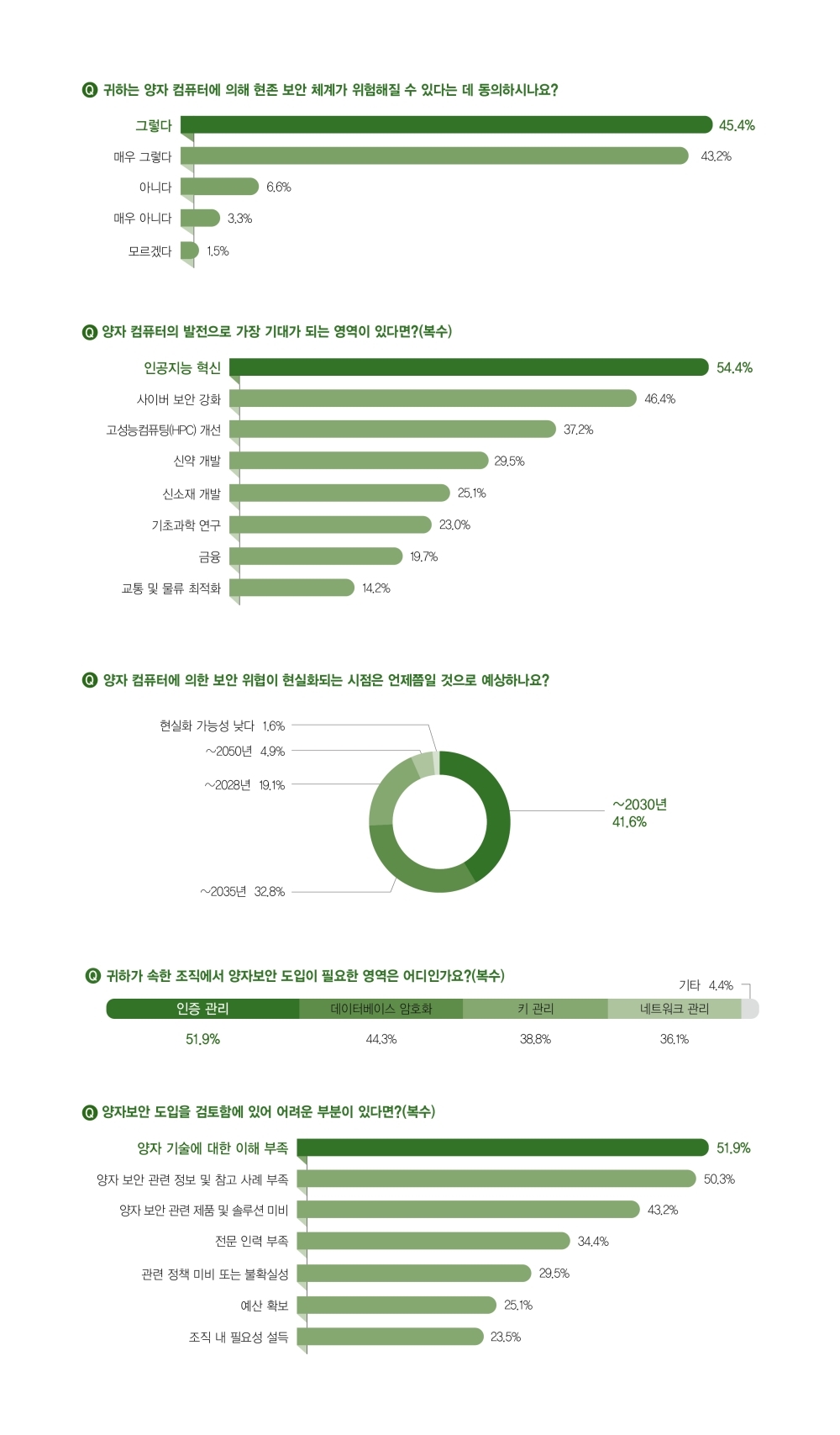 ¾çÀÚ ÄÄÇ»ÅÍ¿¡ ÀÇÇÑ º¸¾È À§ÇùÀÌ Çö½ÇȵǴ ½ÃÁ¡Àº 2030³â¿¡¼ 2035³â »çÀÌ·Î ¿¹»óÇÏ´Â °ÍÀ¸·Î ³ªÅ¸³µ´Ù. ¡®2030³â¡¯À̶õ ÀÀ´äÀÌ 41.6%·Î °¡Àå ¸¹¾Ò°í, ¡®2030-2035³â¡¯À̶õ ÀÀ´äÀÌ 32.8%·Î µÚ¸¦ À̾ú´Ù. ¡®ÇöÀçºÎÅÍ 2028³â »çÀÌ¡¯¶õ ÀÀ´äÀÌ 19.1%¿´°í, ¡®2050³âÀº µÅ¾ß ÇÒ °Í¡¯À̶õ ÀÀ´äÀº 4.9%¿´´Ù.
