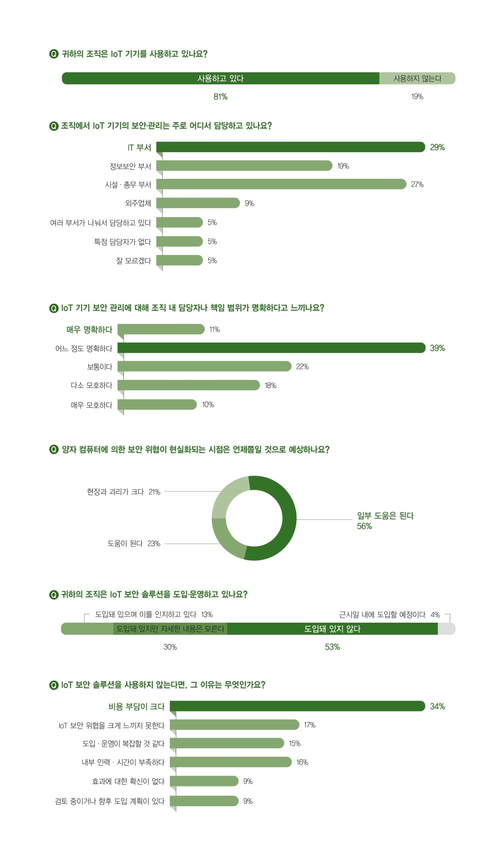IoT º¸¾È ¼Ö·ç¼Ç µµÀÔ ¿©ºÎ¸¦ ¹¯´Â Áú¹®¿¡´Â 53%°¡ ¡®µµÀԵŠÀÖÁö ¾Ê´Ù¡¯°í ´äÇßÀ¸¸ç, 30%´Â ¡®µµÀԵŠÀÖÁö¸¸ ÀÚ¼¼ÇÑ ³»¿ëÀº ¸ð¸¥´Ù¡¯°í ÀÀ´äÇß´Ù.