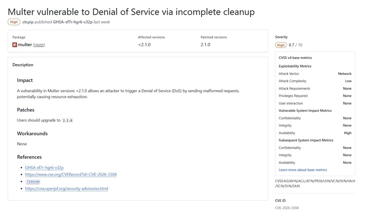 [º¸¾È´º½º Á¶ÀçÈ£ ±âÀÚ] Node.js À¥ ÇÁ·¹ÀÓ¿öÅ©ÀÎ ¿¢½ºÇÁ·¹½ºJS(ExpressJS) »ýŰ迡¼ ³Î¸® »ç¿ëµÇ´Â ÆÄÀÏ ¾÷·Îµå ¹Ìµé¿þ¾î ¡®multer¡¯(¸ÖÅÍ)¿¡¼ ¼¹ö ÀÚ¿øÀ» °í°¥½ÃÄÑ ¼ºñ½º °ÅºÎ(DoS)¸¦ À¯¹ßÇÒ ¼ö ÀÖ´Â °íÀ§Çèµµ Ãë¾àÁ¡(CVE-2026-3304)ÀÌ ¹ß°ßµÆ´Ù. °øÅë Ãë¾àÁ¡ Æò°¡ ½Ã½ºÅÛ(CVSS) 8.7Á¡À» ±â·ÏÇÑ ÀÌ Ãë¾àÁ¡Àº ÇöÀç 2.1.0 ¹öÀüÀ» ÅëÇØ º¸¾È ÆÐÄ¡°¡ ¹èÆ÷µÈ »óÅ´Ù.