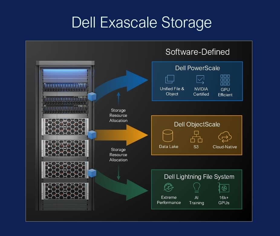 ½ºÅ丮Áö Ãø¸é¿¡¼µµ ´ë±Ô¸ð AI ȯ°æÀ» °í·ÁÇÑ Çõ½ÅÀÌ À̾îÁ³´Ù. ¡®µ¨ ¶óÀÌÆ®´× ÆÄÀÏ ½Ã½ºÅÛ¡¯(Dell Lightning File System)Àº ·¢´ç ÃÖ´ë 150GB/sÀÇ Ã³¸® ¼º´ÉÀ» Á¦°øÇÏ´Â º´·Ä ÆÄÀÏ ½Ã½ºÅÛÀ¸·Î, ±âÁ¸ ´ëºñ ÃÖ´ë 20¹è ³ôÀº ¼º´ÉÀ» ±¸ÇöÇϸç GPU Ȱ¿ëµµ¸¦ ±Ø´ëÈÇÑ´Ù. ¡®µ¨ ¿¢»ç½ºÄÉÀÏ ½ºÅ丮Áö¡¯(Dell Exascale Storage)´Â ÆÄÀÏ, ¿ÀºêÁ§Æ®, º´·Ä ÆÄÀÏ ½Ã½ºÅÛÀ» Çϳª·Î ÅëÇÕÇÑ 3 in 1 ±¸Á¶·Î, µ¨ ÆÄ¿ö¿§Áö ¼¹ö ±â¹Ý¿¡¼ À¯¿¬ÇÑ ¹èÆ÷¸¦ Áö¿øÇϸç ÃÖ´ë 800GbE ³×Æ®¿öÅ© ȯ°æ¿¡¼ ·¢´ç ÃÖ´ë 6TB/s Àб⠼º´ÉÀ» Á¦°øÇÑ´Ù.