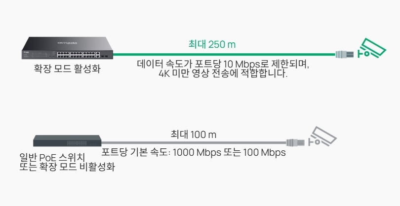 ¶ÇÇÑ º¸¾È °¨½Ã ȯ°æ¿¡ Æ¯ÈµÈ ´Ù¾çÇÑ ±â´ÉÀ» ÅëÇØ ¿î¿µ ¾ÈÁ¤¼ºÀ» °ÈÇÒ ¼ö ÀÖ´Ù. Àå°Å¸® Àü¼Û(Extend Mode) ±â´ÉÀ» Ȱ¿ëÇϸé ÃÖ´ë ¾à 250m °Å¸®±îÁö µ¥ÀÌÅÍ ¹× Àü·Â Àü¼ÛÀÌ °¡´ÉÇØ ³ÐÀº °ø°£¿¡¼µµ À¯¿¬ÇÑ ¹è¼± ±¸¼ºÀÌ °¡´ÉÇϸç, Æ÷Æ® °Ý¸®(Port Isolation)´Â Ä«¸Þ¶ó °£ ºÒÇÊ¿äÇÑ Åë½ÅÀ» Â÷´ÜÇØ º¸¾È¼ºÀ» ³ôÀÌ°í ³×Æ®¿öÅ© Æ®·¡ÇÈÀ» È¿À²ÀûÀ¸·Î ºÐ»ê½ÃŲ´Ù.