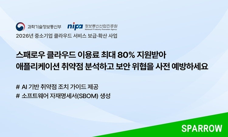 Áß¼Ò±â¾÷ Ŭ¶ó¿ìµå ¼ºñ½º º¸±Þ¡¤È®»ê »ç¾÷Àº µðÁöÅÐ Àüȯ ÃËÁø ¹× ±¹³» »ê¾÷ °æÀï·Â °È¸¦ À§ÇØ ÄÁ¼³ÆÃ°ú ¼ºñ½º ÀÌ¿ë·á¸¦ Áö¿øÇÏ´Â Á¤ºÎ ÁÖµµ ÇÁ·Î±×·¥ÀÌ´Ù. °ø±Þ»ç·Î ¼±Á¤µÈ ½ºÆÐ·Î¿ì´Â Áß¼Ò±â¾÷ÀÌ ¼ÒÇÁÆ®¿þ¾î(SW) °ø±Þ¸Á º¸¾ÈÀ» °ÈÇÏ°í º¸¾È »ç°¢Áö´ë¸¦ ÃÖ¼ÒÈÇÒ ¼ö ÀÖµµ·Ï, ¼ºñ½ºÇü ¼ÒÇÁÆ®¿þ¾î(SaaS) ±â¹ÝÀÇ ¾ÖÇø®ÄÉÀÌ¼Ç º¸¾È Ãë¾àÁ¡ ºÐ¼® ¼Ö·ç¼ÇÀÎ ¡®½ºÆÐ·Î¿ì Ŭ¶ó¿ìµå¡¯(Sparrow Cloud)¸¦ Á¦°øÇÑ´Ù. ¼ö¿ä ±â¾÷Àº ÀÌ¿ë·áÀÇ 80%¸¦ Áö¿ø¹Þ¾Æ, 20%ÀÇ ºñ¿ëÀ¸·Î Ãë¾àÁ¡ ºÐ¼®À» ÀÌ¿ëÇÒ ¼ö ÀÖ´Ù.