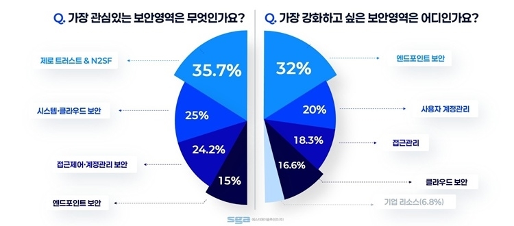 °¡Àå °ü½É ÀÖ´Â º¸¾È ¿µ¿ªÀ» ¹¯´Â Áú¹®¿¡ Àüü ÀÀ´äÀÚÀÇ 35.7%°¡ ¡®Á¦·Î Æ®·¯½ºÆ®¿Í N2SF¡¯¸¦ 1¼øÀ§·Î Áö¸ñÇß´Ù. ÀÌ¾î ½Ã½ºÅÛ°ú Ŭ¶ó¿ìµå º¸¾È, Á¢±ÙÁ¦¾î¿Í °èÁ¤°ü¸® º¸¾È, ¿£µåÆ÷ÀÎÆ® º¸¾È ¼øÀ¸·Î ÀÀ´ä ºñÀ²ÀÌ ³ô¾Ò´Ù.