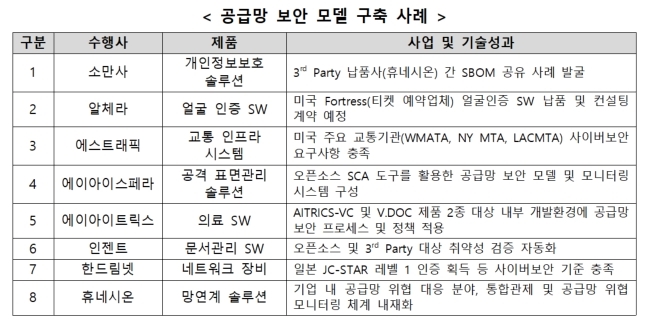 Áö³ÇØ 8°³ ±â¾÷¿¡ ´ëÇØ óÀ½ »ç¾÷À» ÁøÇà, ½ÇÁ¦ ±â¾÷ ȯ°æ¿¡¼ SBOMÀ» Ȱ¿ëÇØ °ø±Þ¸Á º¸¾È °ü¸®Ã¼°è¸¦ ±¸ÃàÇÏ°í º¸¾È Ãë¾àÁ¡±îÁö ÀÚüÀûÀ¸·Î Á¶Ä¡ÇÒ ¼ö ÀÖ°Ô ÇÏ´Â ´Ù¾çÇÑ °ø±Þ¸Á º¸¾È ¸ðµ¨À» ¸¶·ÃÇÏ´Â µî ¼º°ú¸¦ °Åµ×´Ù.
