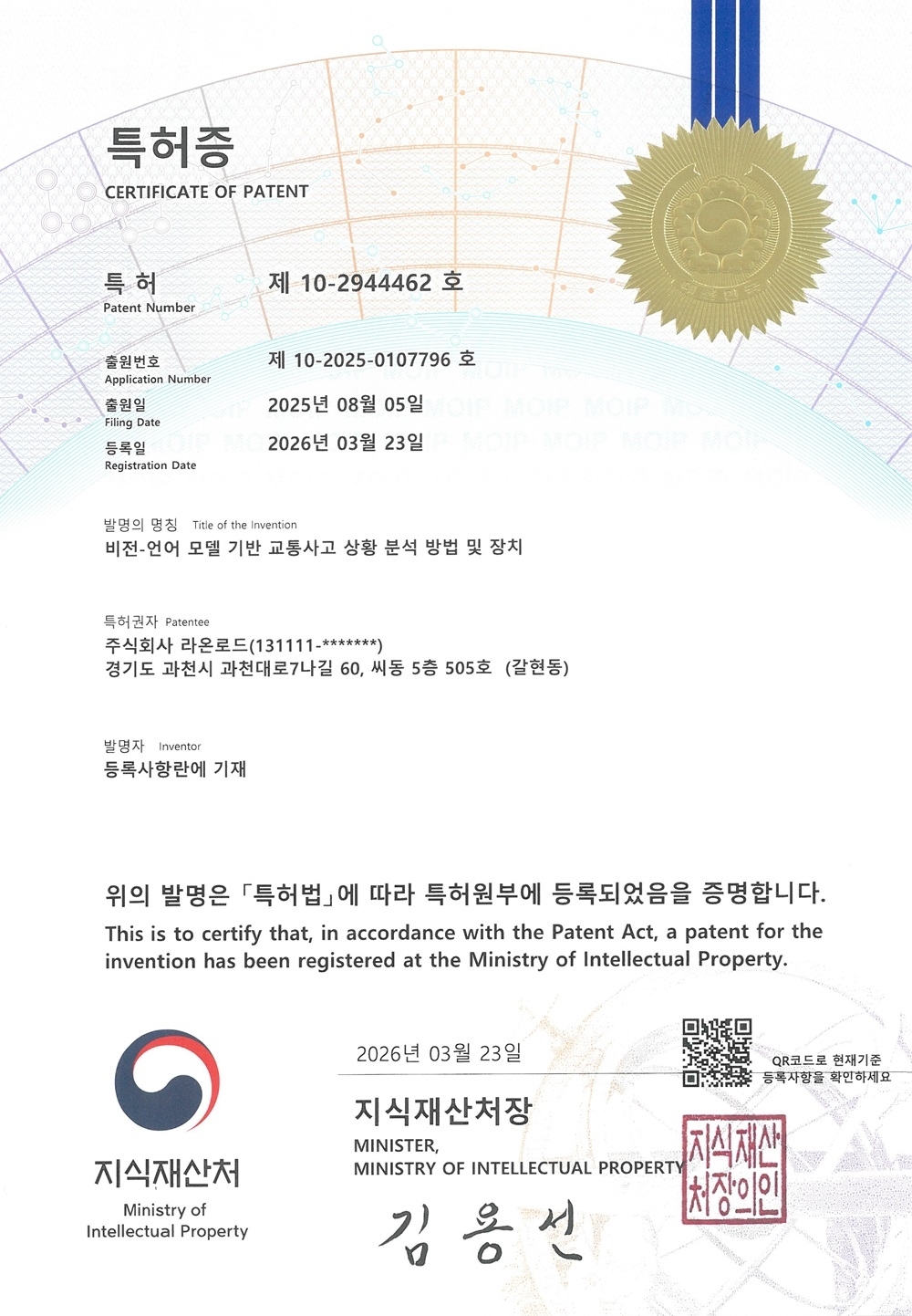 ¶ó¿ÂÇÇÇÃÀÇ ÀÚȸ»çÀÎ ¶ó¿Â·Îµå(´ëÇ¥ À̼®Áß)´Â ºñÀü¾ð¾î¸ðµ¨(VLM) ±â¹ÝÀÇ ¡®±³Åë»ç°í »óȲºÐ¼®¹æ¹ý ¹× ±³Åë»ç°í »óȲºÐ¼®ÀåÄ¡¡¯¿¡ °üÇÑ Æ¯Ç㸦 µî·ÏÇÏ°í ±â¼ú »ó¿ëÈ¿¡ ³ª¼±´Ù°í 17ÀÏ ¹àÇû´Ù.
