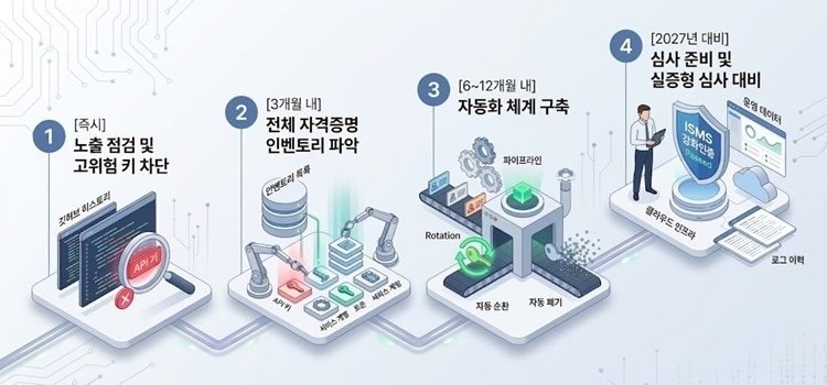 [6~12°³¿ù ³»] ÀÚµ¿È ÆÄÀÌÇÁ¶óÀÎ ±¸Ãà ´Ü°è´Ù. ÀÚ°ÝÁõ¸íÀÇ Å½Áö¡¤¼øÈ¯(Rotation)ºÎÅÍ Æó±â, °¨»ç ·Î±×ÀÇ ÀÚµ¿È¸¦ ´Ü°èÀûÀ¸·Î ó¸®ÇÑ´Ù. Àλç ÇÁ·Î¼¼½º ¿¬µ¿µÈ ÀÚ°ÝÁõ¸í Æó±â³ª CI/CD ÆÄÀÌÇÁ¶óÀÎ ³» ÇϵåÄÚµù ŽÁö ¼øÀ¸·Î ¿ì¼±¼øÀ§¸¦ Àâ´Â ¹æ½Ä µîÀ» °í·ÁÇØº¼ ¼ö ÀÖ´Ù.