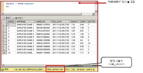 TDE·Î ¾ÏÈ£ÈµÈ Å×À̺íÀÇ ¼ÒÀ¯ÀÚ(¡®sa¡¯, DBA)°¡ Á¶È¸ ÇßÀ» ¶§ÀÇ °á°ú¿Í ´Ù¸¥ »ç¿ëÀÚ(¡®WEB_ADMIN¡¯)°¡ Á¢¼ÓÇÏ¿© Á¶È¸ ÇßÀ» ¶§ÀÇ °á°ú¸¦ ºñ±³ÇÑ´Ù.