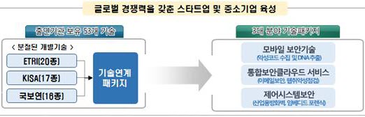 ÀÌ¿Í ÇÔ²² Çѱ¹ÀüÀÚÅë½Å¿¬±¸¿ø(ETRI), Çѱ¹ÀÎÅͳÝÁøÈï¿ø(KISA), ±¹°¡º¸¾È±â¼ú¿¬±¸¼Ò(NSR) µî Á¤º¸º¸È£ Àü¹® ¿¬±¸±â°üÀÇ R&D ¼º°ú¹° Áß 53°³ À¯¸Á±â¼ú°ú ¸ð¹ÙÀÏ º¸¾È, ÅëÇÕº¸¾È Ŭ¶ó¿ìµå, IoT¡¤Á¦¾î½Ã½ºÅÛ º¸¾È µî 3´ë ºÐ¾ß ±â¼ú ÆÐŰÁöÀÇ Ã¼°èÀûÀÎ ¿¬°è¡¤Áö¿øÀ» ÅëÇØ ±Û·Î¹ú °æÀï·ÂÀ» °®Ãá ½ºÅ¸Æ®¾÷¡¤Áß¼Ò±â¾÷ À°¼ºÀ» ÃßÁøÇØ ³ª°¥ °èȹÀÌ´Ù.