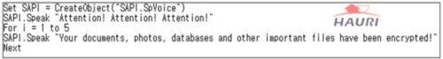 À̶§ »ý¼ºµÈ vbs ÆÄÀÏÀ» ÅëÇØ PC¿¡¼ ¡®Attention! Attention! Attention!¡¯, ¡®Your documents, photos, databases and other important files have been encrypted!¡¯¶ó´Â À½¼ºÀÌ ³ª¿Â´Ù.