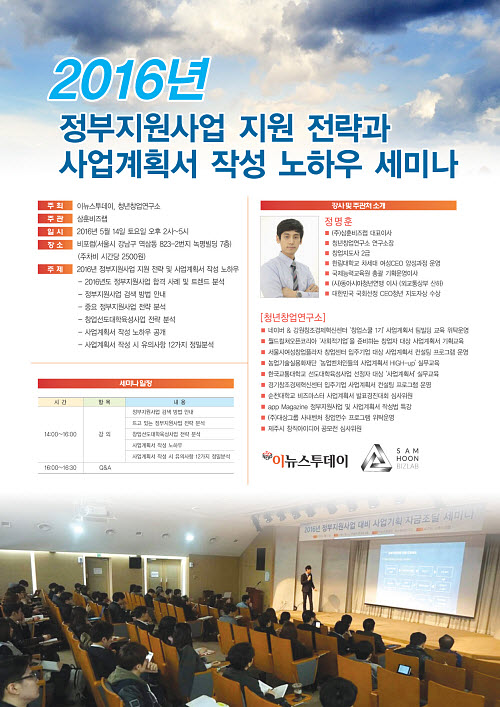 ÀÌ´º½ºÅõµ¥ÀÌ¿Í Ã»³ââ¾÷¿¬±¸¼Ò°¡ °øµ¿ ÁÖÃÖÇÏ°í »ïÈÆºñÁî·¦ÀÌ ÁÖ°üÇÏ´Â À̹ø ¼¼¹Ì³ª¿¡¼´Â ¡â2016³âµµ Á¤ºÎÁö¿ø»ç¾÷ ÇÕ°Ý »ç·Ê ¹× Æ®·»µå ºÐ¼® ¡âÁ¤ºÎÁö¿ø»ç¾÷ °Ë»ö ¹æ¹ý ¡âÁß¿ä Á¤ºÎÁö¿ø»ç¾÷ Àü·« ºÐ¼® ¡ââ¾÷¼±µµ´ëÇÐÀ°¼º»ç¾÷ Àü·« ºÐ¼® ¡â»ç¾÷°èȹ¼ ÀÛ¼º ³ëÇÏ¿ì ¹× ÀÛ¼º ½Ã À¯ÀÇ»çÇ× 12°¡Áö Á¤¹ÐºÐ¼® µîÀÇ ³»¿ëÀÌ ´Ù·ïÁú ¿¹Á¤ÀÌ´Ù.