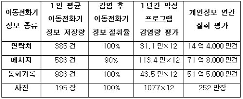 À̵¿Àüȱ⠻ç¿ëÀÚÀÇ 1³â°£ °³ÀÎÁ¤º¸ ÀýÃë ÇÇÇØ ¼ö·®(1ÀÎ´ç Æò±Õ À̵¿Àüȱâ Á¤º¸ ÀúÀå·® ¡¿ °¨¿°ÈÄ À̵¿Àüȱâ Á¤º¸ ÀýÃëÀ² ¡¿ 1³â°£ ¾Ç¼º ÇÁ·Î±×·¥ °¨¿°·®)ÀÇ °æ¿ì, ¿¬¶ôó´Â 14¾ï4,000¸¸°Ç, ¸Þ½ÃÁö 71¾ï8,000¸¸°Ç, Åëȱâ·Ï 51¾ï5,000¸¸°Ç, »çÁøÀº 252¸¸Àå¿¡ ´ÞÇÏ´Â °ÍÀ¸·Î Ãß»êµÆ´Ù.