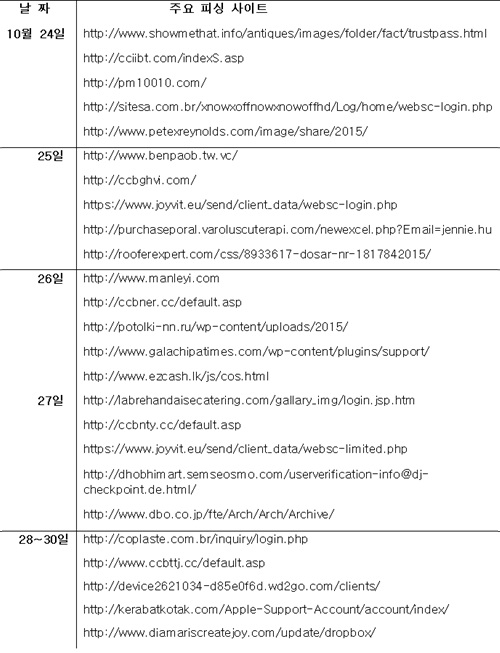Áö³ 10¿ù ¸¶Áö¸· ÁÖ ÀϺ°·Î Áß±¹¿¡¼ ¸ÍÀ§¸¦ ¶³Ä£ ÇÇ½Ì »çÀÌÆ® ¡®Åé5¡¯¿¡´Â ¡âÁß±¹ ÃÖ´ë ÀüÀÚ»ó°Å·¡ ȸ»ç ¾Ë¸®¹Ù¹Ù(Alibab)¸¦ °¡ÀåÇÑ www.showmethat.info/antiques/images/folder/fact/trustpass.html, http://labrehandaisecatering.com/gallary_img/login.jsp.htm, http://coplaste.com.br/inquiry/login.php (Ä«µå ¹øÈ£¿Í ºñ¹Ð¹øÈ£ ÈÉħ) ¡âÁß±¹°Ç¼³ÀºÇàÀ» »çĪÇÑ http://cciibt.com/indexS.asp, http://ccbghvi.com/, http://ccbner.cc/default.asp, http://ccbnty.cc/default.asp, www.ccbttj.cc/default.asp (Ä«µå ¹øÈ£¿Í ºñ¹Ð¹øÈ£ ÆíÃë) ¡âÁß±¹ ³» ÃÖ´ë Åë½Å¼ºñ½ºÈ¸»çÀÎ Áß±¹À̵¿Åë½Å(China Mobile)ÀÎ °Íó·³ ¼ÓÀÎ http://pm10010.com/, www.manleyi.com (Àû¸³ Æ÷ÀÎÆ®ÀÇ Çö±Ý±³È¯À» ¹Ì³¢·Î Ä«µå ¹øÈ£¿Í ºñ¹Ð¹øÈ£ »©³¿) ¡â¿Â¶óÀÎ ±ÝÀ¶°áÁ¦ »çÀÌÆ® ÆäÀÌÆÈ(Paypal)·Î À§ÀåÇÑ http://sitesa.com.br/xnowxoffnowxnowoffhd/Log/home/websc-login.php, www.joyvit.eu/send/client_data/websc-login.php, www.joyvit.eu/send/client_data/websc-limited.php, http://device2621034-d85e0f6d.wd2go.com/clients/ (Ä«µå ¹øÈ£¿Í ºñ¹Ð¹øÈ£ ÈÉħ) ¡â°¡Â¥ Áö¸ÞÀÏ(Gmail) ÀüÀÚ¿ìÆíÇÔ·ù www.petexreynolds.com/image/share/2015/, www.diamariscreatejoy.com/update/dropbox/, www.dbo.co.jp/fte/Arch/Arch/Archive/ (°èÁ¤°ú ºñ¹Ð¹øÈ£ »©³¿) ¡âÁß±¹ÆÇ TV ¿À¶ô ÇÁ·Î±×·¥ ¡®·±´×¸Ç¡¯ÀÎ ¡®´Þ·Á¶ó ÇüÁ¦¡¯¸¦ »çĪÇÑ ´ç÷·ù www.benpaob.tw.vc/ (´ç÷ Á¤º¸¸¦ ¹Ì³¢·Î ±ÝÀü ÀÌü À¯µµ) ¡â°¡Â¥ À©µµ¿ì ¿¢¼¿(Windows Excel)·ù http://purchaseporal.varoluscuterapi.com/newexcel.php?Email=jennie.hu (°èÁ¤°ú ºñ¹Ð¹øÈ£ »©³¿) ¡â¾ßÈÄ(Yahoo) ¸ÞÀÏÇÔÀ» °¡ÀåÇÑ http://rooferexpert.com/css/8933617-dosar-nr-1817842015/, www.ezcash.lk/js/cos.html (°èÁ¤°ú ºñ¹Ð¹øÈ£ ÈÉħ) ¡â¿ÀÇǽº(Office) ÇÁ·Î±×·¥À» °¡ÀåÇÑ http://potolki-nn.ru/wp-content/uploads/2015/ (°èÁ¤°ú ºñ¹Ð¹øÈ£ ³ë¸²) ¡â¾ÖÇÃÀÇ ¾ÆÀÌÆªÁî(iTunes)·Î À§ÀåÇÑ www.galachipatimes.com/wp-content/plugins/support/ (¾ÖÇà °èÁ¤°ú ºñ¹Ð¹øÈ£ ÈÉħ) ¡â¿Â¶óÀÎ ¼îÇθô À̺£ÀÌ(ebay)¸¦ °¡ÀåÇÑ http://dhobhimart.semseosmo.com/userverification-info@dj-checkpoint.de.html/ (¸ÞÀÏ °èÁ¤°ú ºñ¹Ð¹øÈ£ ÈÉħ) ¡â°¡Â¥ ¾ÖÇÃ(Apple ID)·ù http://kerabatkotak.com/Apple-Support-Account/account/index/ (¾ÖÇà °èÁ¤°ú ºñ¹Ð¹øÈ£ ³ë¸²) µîÀÌ ²ÅÇû´Ù.
