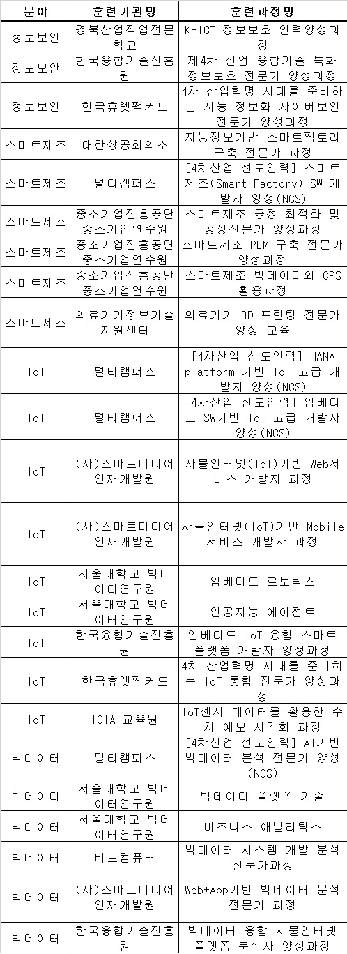 À̵é ÈÆ·Ã±â°ü¿¡¼´Â Á¤º¸º¸¾È, »ç¹°ÀÎÅͳÝ, ºòµ¥ÀÌÅÍ, ½º¸¶Æ®Á¦Á¶ µî 4°³ ºÐ¾ß ÃÑ 24°³ÀÇ ÈÆ·Ã°úÁ¤ÀÌ Á¦°øµÈ´Ù. ƯÈ÷, IoT °í±Þ °³¹ßÀÚ ¾ç¼º°úÁ¤, ÀΰøÁö´É ¿¡ÀÌÀüÆ®, ½º¸¶Æ® ÆÑÅ丮 ±¸Ãà Àü¹®°¡°úÁ¤, ºòµ¥ÀÌÅÍ Ç÷§Æû ±â¼ú µî ´Ù¾çÇÑ °úÁ¤À» ÅëÇØ 626¸íÀÇ ±â¾÷ ¸ÂÃãÇü ÇÙ½É Àü¹®ÀηÂÀ» ½Å¼Ó ¾ç¼ºÇÒ °èȹÀÌ´Ù.