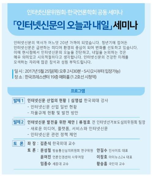 [º¸¾È´º½º ±Ç ÁØ ±âÀÚ] ÀÎÅͳݽŹ®À§¿øÈ¸(À§¿øÀå ¹æÀçÈ«)´Â Çѱ¹¾ð·ÐÇÐȸ(ȸÀå ¹®Ã¶¼ö)¿Í ÇÔ²² ¿À´Â 25ÀÏ(¸ñ) Çѱ¹ÇÁ·¹½º¼¾ÅÍ 19Ãþ ¸ÅȭȦ¿¡¼­ 'ÀÎÅͳݽŹ®ÀÇ ¿À´Ã°ú ³»ÀÏ'À» ÁÖÁ¦·Î ¼¼¹Ì³ª¸¦ ¿¬´Ù.