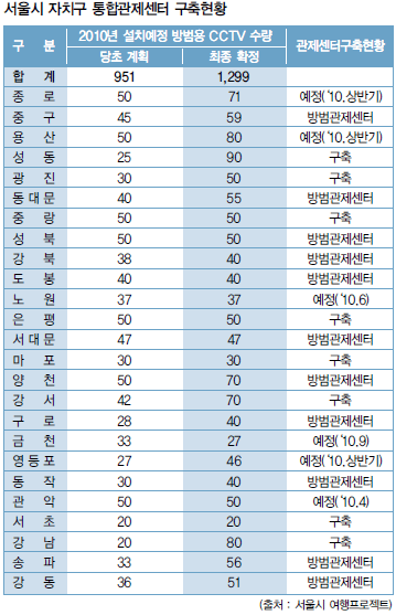 ¼¿ï½Ã 25°³ ±¸Ã» Áß ÅëÇÕ°üÁ¦¼¾Å͸¦ ±¸ÃàÇÑ °÷Àº ¾ó¸¶³ª µÉ±î? º»Áö°¡ Á¶»çÇÑ ¹Ù¿¡ µû¸£¸é ÇöÀç ÅëÇÕ°üÁ¦¼¾Å͸¦ ¿î¿µÇÏ´Â °÷Àº °¼±¸, ±¤Áø±¸, ¸¶Æ÷±¸, ¼Ãʱ¸, ¼ºµ¿±¸, ÀºÆò±¸, Áß¶û±¸, °³²±¸ µî 8°÷À̸ç, Á¾·Î±¸, ¿ë»ê±¸, ³ë¿ø±¸, ±Ýõ±¸, ¿µµîÆ÷±¸, °ü¾Ç±¸ µî 2010³â ±¸Ã࿹Á¤ÀÎ °÷ÀÌ 6°÷ÀÌ´Ù. ¶ÇÇÑ ÅëÇÕ°üÁ¦¼¾ÅͰ¡ ¾Æ´Ñ ¹æ¹ü°üÁ¦¼¾Å͸¦ ¿î¿µÇϰí ÀÖ´Â °÷Àº Áß±¸ µî 11°÷À̸ç, À̵é Áß ´ëºÎºÐÀÌ ÅëÇÕ°üÁ¦¼¾ÅÍ ±¸Ãà°èȹÀ» °¡Áö°í ÀÖ´Ù. À̹ۿ¡ ³ª¸ÓÁö ±¸µéµµ ±¸Ãà°èȹÀ» ¼¼¿ü°Å³ª ¿¹Á¤À» Çϰí ÀÖ¾î ¼¿ï½Ã ´ëºÎºÐÀÇ ±¸µéÀÌ ÅëÇÕ°üÁ¦¼¾Å͸¦ ¿î¿µÇÒ °ÍÀ¸·Î º¸ÀδÙ.