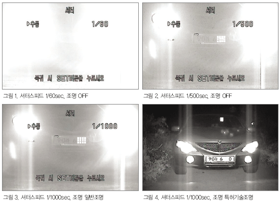 ÀÚµ¿Â÷ÀÇ ¹øÈ£¸¦ ½Äº°Çϱâ À§Çؼ´Â ÀÚµ¿Â÷ÀÇ Çìµå¶óÀÌÆ®¿¡¼ ³ª¿À´Â ºûÀ» »ó¼â ÇÒ ¼ö ÀÖ´Â ¼ÅÅÍ ½ºÇǵ带 ¼±ÅÃÇØ¾ß ÇÑ´Ù. ±×¸² 1 ~ ±×¸² 2¿¡¼ º¸´Â ¹Ù¿Í °°ÀÌ ÃÖ¼ÒÇÑ ¼ÅÅͽºÇǵ尡 1/1000sec ÀÌ»ó µÇ¾î¾ß ÇÑ´Ù. ±×¸² 3°ú °°ÀÌ ÀÏ¹Ý LED Á¶¸íÀ¸·Î´Â 1/1000sec ¿¡¼´Â Á¶¸íÀÇ È¿°ú°¡ ¾ø´Ù. ¿©±â¼´Â ±×¸² 4¿Í °°ÀÌ 1/1000sec ÀÌ»óÀÇ ¼ÅÅÍ ½ºÇǵ忡¼µµ Á¶¸íÀÇ È¿°ú°¡ È®½ÇÇÑ Á¶¸íÀåÄ¡ ±â¼úÀ» ¼Ò°³ÇϰíÀÚ ÇÑ´Ù.