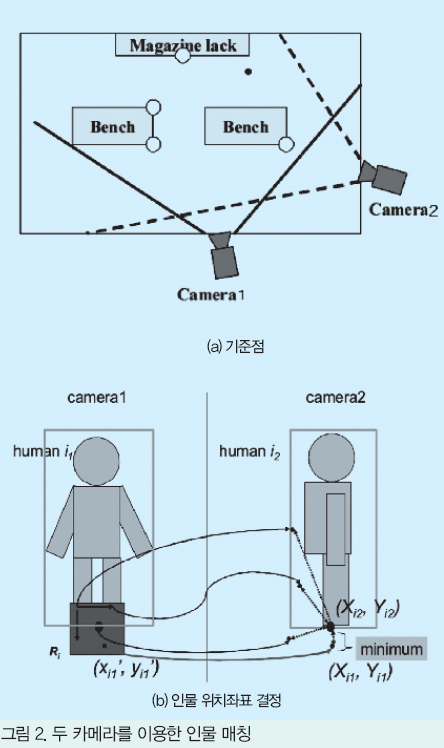 ¿©±â¿¡¼ Ä«¸Þ¶ó1ÀÌ Æ÷ÂøÇϰí ÀÖ´Â Àι° i1ÀÇ À§Ä¡¸¦(x1, y1), Ä«¸Þ¶ó2°¡ Æ÷ÂøÇϰí ÀÖ´Â Àι° i2ÀÇ À§Ä¡¸¦ (x2, y2)·Î ÇÑ´Ù. ´Ü ÀÌ Á¡Àº ±âÁØÁ¡°ú °°ÀÌ ¹Ù´Ú ¸é À§¿¡ ÀÖ¾î, ±×¸² 2(b)¿Í °°ÀÌ Àι°À» µÑ·¯½Î´Â Å׵θ®ÀÇ Àúº¯ ÁßÁ¡À¸·Î ºñÃçÁø´Ù.