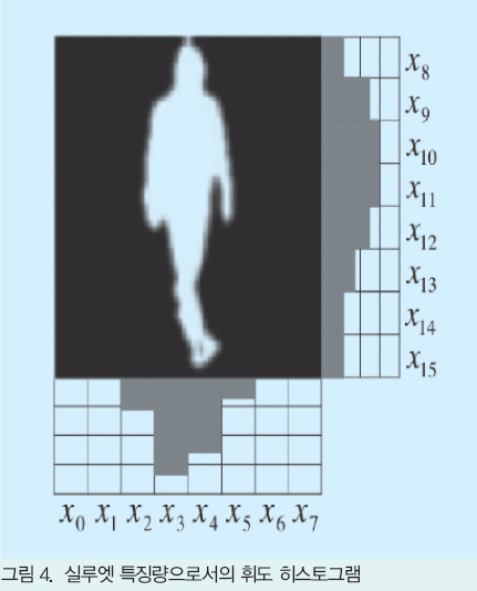 ¿ø·¡ÀÇ ½Ç·ç¿§ À̹ÌÁö¿¡ ÀÇÇÑ ÆÐÅÏÀνĿ¡¼´Â »ó¼¼ÇÑ ½Ç·ç¿§ÀÇ ÆÇº°ÀÌ °¡´ÉÇÑ ¹Ý¸é, Ư¡·®ÀÌ °íÂ÷¿øÀ̱⠶§¹®¿¡ ƯÁ¤ ¼ººÐ¿¡ ³ªÅ¸³ª´Â ÀâÀ½ÀÇ ¿µÇâÀ» ¹Þ±â ½±´Ù´Â °áÁ¡ÀÌ ÀÖ´Ù. °Å±â¿¡¼ ÀÌ ¹æ¹ý¿¡¼´Â, 2Áø ½Ç·ç¿§ À̹ÌÁöÀÇ ¼¼·Î¹æÇâ°ú °¡·Î¹æÇâÀ» °¢°¢ 8ºÐÇÒ ÇÑ ÇÕ°è 16¿µ¿ªÀÇ Çȼ¿ ´ÜÀ§ÀÇ ÈÖµµ È÷½ºÅä±×·¥À» ¼ººÐÀ¸·Î Çϴ Ư¡·® º¤ÅÍ x=(x0, x1, ¡¦, x15)¸¦ ½Ç·ç¿§ Ư¡ ·®À¸·Î¼ »ç¿ëÇß´Ù. ÇÑÆí, (x0, x1, ¡¦, x7)Àº ¼öÆò¹æÇâÀÇ, (x8, x9, ¡¦, x15)´Â ¼öÁ÷¹æÇâÀÇ ÈÖµµ È÷½ºÅä±×·¥À» ³ªÅ¸³»°í ÀÖ´Ù(±×¸² 4). ±×¸² 5´Â °¢ ÀÚ¼¼ÀÇ ½Ç·ç¿§ Ư¡ ·®À» ³ªÅ¸³½´Ù. ÆÐÅÏÀνĿ¡¼´Â ¿ì¼± °¢ ÀÚ¼¼ÀÇ ½Ç·ç¿§ Ư¡ ·® ÇнÀ µ¥ÀÌÅͰ¡ ÀÛ¼ºµÅ, ±×°ÍµéÀÇ ÇнÀ µ¥ÀÌÅÍ¿ÍÀÇ Ç¥ÁØ À¯Å¬¸®µå °Å¸®°¡ °¡Àå °¡±î¿î µ¥ÀÌÅ͸¦ Å×½ºÆ® µ¥ÀÌÅÍ ÀÚ¼¼ÆÇº° °á°ú·Î ÇÑ´Ù.
