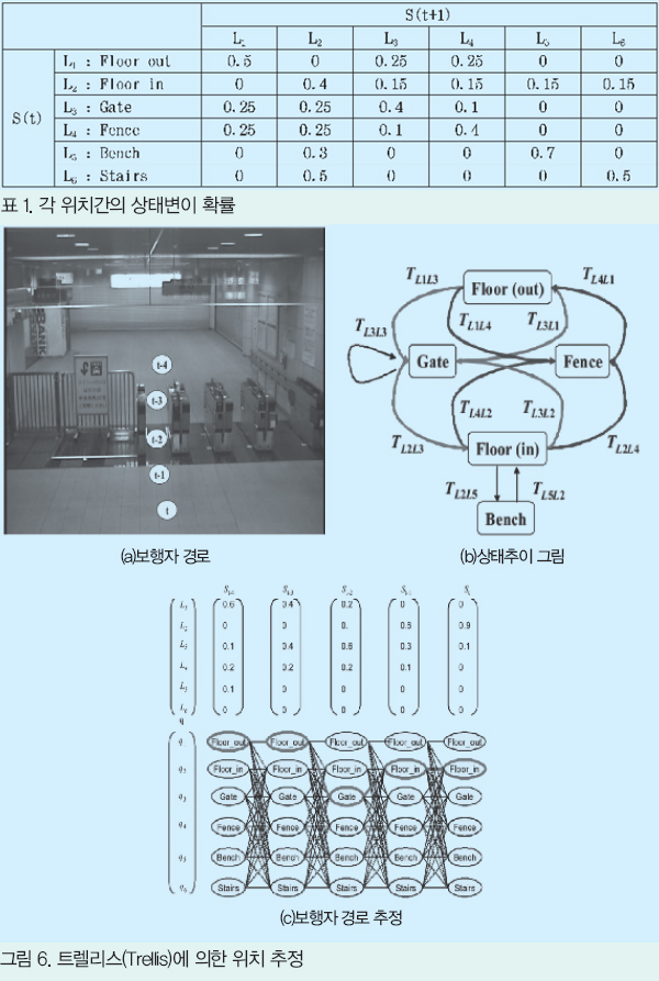 ±×¸®°í Ç¥ 2ÀÇ p(Li)(i=1, ¡¦, 6)´Â °¢ À§Ä¡ÀÇ ¿ÀºêÁ§Æ®(Àι°)ÀÇ Á¸Àç È®·üÀÌ´Ù. ±×°ÍµéÀ» ¹ÙÅÁÀ¸·Î ÇÑ À§Ä¡ ÃßÁ¤ÀÇ °á°ú°¡ ¡®Transition of Locations¡¯ÀÇ Çà¿¡ ³ªÅ¸³»°í ÀÖ´Ù.