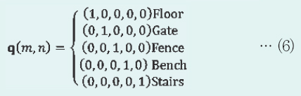 º» ÇÁ·¹ÀÓ¿öÅ©¿¡ ÀÖ¾î¼ À§Ä¡Á¤º¸¶õ ¿ÀºêÁ§Æ®ÀÇ ÁÂÇ¥Á¤º¸¿¡ ´ëÀÀÇÏ´Â ÀǹÌÀûÀÎ À§Ä¡Á¤º¸´Ù. ¿ª ±¸³»ÀÇ À§Ä¡·Î¼´Â Ç÷ξî, °³Âû±¸, °è´Ü, Ȩ, º¥Ä¡ µîÀ» µé ¼ö ÀÖ´Ù. À̹ÌÁö»óÀÇ À§Ä¡´Â ÀÔµµ(Ø£Óø)°¡ °ÅÄ£ ÀÏÁ¤ ¿µ¿ª¸¶´Ù ¼³Á¤µÅ, ±× ¿µ¿ª³»ÀÇ 8¡¿8Çȼ¿ÀÇ »çÀÌÁîÀÇ ºí·Ï ´ÜÀ§·Î Á¤ÀǵȴÙ. °¢ ºí·ÏÀÇ À§Ä¡´Â ±× Á¤ÀÇµÈ ºí·ÏÀ» ±âÁ¡À¸·Î ÇØ¼ °¡¿ì½º ºÐÆ÷¸¦ µû¸£´Â È®·üÀûÀÎ È®´ë(³ÐÀÌ)¸¦ °¡Áö´Â °ÍÀ¸·Î ÇÑ´Ù. À§Ä¡´Â È®·üÀûÀÎ È®´ë(³ÐÀÌ)¸¦ °¡Áö±â ¶§¹®¿¡ °¢ ºí·Ï¿¡¼´Â À§Ä¡ º¤ÅͰ¡ »ý¼ºµÈ´Ù. ¿¹·Î¼ Á᫐ À§Ä¡ ÁÂÇ¥°¡ (xm, yn)ÀÎ ºí·Ï 1(x, y, m, n)ÀÇ À§Ä¡ º¤ÅÍq(m, n)´Â ½Ä (5) ¹× (6)À¸·Î ±¸¼ºµÇ´Â È®·üÀûÀÎ ºÐÆ÷¸¦ °¡Áø´Ù. ÇÑÆí q(m, n)´Â À§Ä¡ (m, n)ÀÇ ºí·ÏÀÇ À§Ä¡ Á¤º¸¸¦ ³ªÅ¸³»´Â 5Â÷¿ø (°¢ Â÷¿øÀº °¢°¢ Floor, Gate, Fence, Bench, Stairs¿¡ »ó´ç)ÀÇ º¤ÅÍ´Ù.