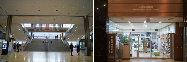 ÃâÀÔ±¸¿¡ µé¾î¼¸é 2ÃþÀ¸·Î ¿Ã¶ó°¥ ¼ö ÀÖ´Â °è´ÜÀÌ Á¤¸é¿¡ º¸À̰í, ÁÂÃøÀ¸·Î´Â Ưº°Àü½Ã°üÀÌ ¿ìÃøÀ¸·Î´Â ¼¿ï¿ª»ç°¡ ´ã°ÜÀִ åÀ» º¼ ¼ö ÀÖ´Â ¼¿ï¿ª»çÀÚ·á½ÇÀÌ ÀÖ´Ù.