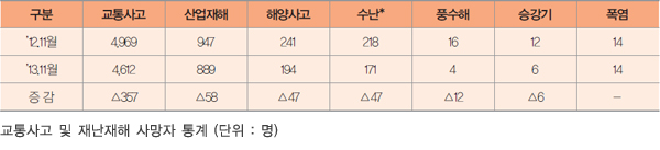 »ç°Ç¡¤»ç°í ½ÇÁ¦ Åë°è¿¡ À־µµ ¾ÈÀüºÐ¾ß Àü¹Ý¿¡¼­ »ç¸Á»ç°í°¡ °¨¼ÒÇß´Ù. ±³Åë»ç°íÀÇ °æ¿ì ¡¯12³â 11¿ù±îÁö 4,969¸íÀÌ´ø »ç¸ÁÀÚ°¡ ±Ý³â 11¿ù¿¡´Â 4,612¸íÀ¸·Î 357¸íÀÌ °¨¼ÒÇßÀ¸¸ç »ê¾÷ÀçÇØ¡¤Çؾç»ç°íµµ °¢°¢ Àü³â´ëºñ »ç¸ÁÀÚ°¡ 58¸í, 47¸í °¨¼ÒÇÏ´Â µî 6°³ ºÐ¾ß¿¡¼­ 527¸íÀÇ »ç¸ÁÀÚ°¡ °¨¼ÒÇß´Ù.