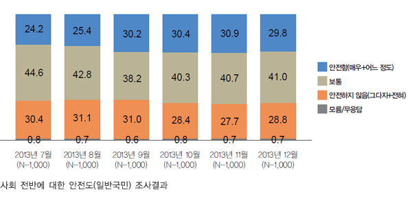 Áö³­ÇØ ¿ì¸®³ª¶ó ±¹¹Îµé Áß ¿ì¸® »çȸ°¡ Àü¹ÝÀûÀ¸·Î ¡®¾ÈÀüÇÏ´Ù¡¯°í ´À³¢°í ÀÖ´Â ±¹¹ÎÀº ¾à 29.8%·Î ³ªÅ¸³µ´Âµ¥, ÀÌ´Â Áö³­ 7¿ù 24.2%¿Í ºñ±³ÇÒ ¶§ 5.6%P Áõ°¡ÇÑ °ÍÀ¸·Î ÃÖ±Ù¿¡ ±¹¹ÎµéÀÇ ¾ÈÀü ü°¨µµ°¡ ³ô¾ÆÁö°í ÀÖ´Â °ÍÀ¸·Î ºÐ¼®µÆ´Ù. ¼ºÆø·Â/Çб³Æø·Â/°¡Á¤Æø·Â¿¡ ´ëÇØ ºÒ¾ÈÇÏ´Ù°í ´À³¢°í ÀÖ´Â ±¹¹ÎÀº °¢°¢ 44.3%, 52.8%, 14.8%·Î ³ªÅ¸³µÀ¸¸ç 7¿ù Á¶»ç°á°ú¿Í ºñ±³ÇÒ ¶§ ¼ºÆø·Â/Çб³Æø·ÂÀº ºÒ¾ÈÇÏ´Ù´Â ÀÀ´äÀÌ °¢°¢ 10%P, 15.8%P °¨¼ÒÇØ ¾ÈÀü ü°¨µµ°¡ Áõ°¡ÇÑ °ÍÀ¸·Î ºÐ¼®µÆ´Ù.