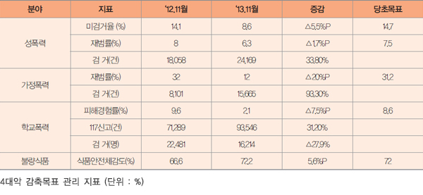 dz¼öÇØÀÇ °æ¿ì´Â ¡®73³â ÀÌÈÄ ÃÖÀå À帶¿¡µµ ºÒ±¸Çϰí ÃÖ±Ù 10³â Æò±Õ ´ëºñ Àθí ÇÇÇØ´Â 90% °¨¼Ò(40¸í¡æ4¸í)Çϰí, Àç»êÇÇÇØ´Â 84.3% °¨¼Ò(9,962¾ï¡æ1,565¾ï)ÇßÀ¸¸ç, ¼ºÆø·Â, °¡Á¤Æø·Â Àç¹ü·ü µî 4´ë¾Ç °¨Ãà¸ñÇ¥°ü¸® ÁöÇ¥µµ ¿©°¡ºÎ¡¤±³À°ºÎ¡¤¹ý¹«ºÎ¡¤¾ÈÇàºÎ¡¤½Ä¾à󡤰æÂûû µî °ü·ÃºÎóÀÇ Àû±ØÀûÀÎ ÇöÀåȰµ¿°ú Á¤Ã¥ÀûÀÎ ³ë·ÂÀ¸·Î ±Ý³âµµ ¸ñÇ¥¸¦ »óȸÇÏ¿© °³¼±µÆ´Ù.
