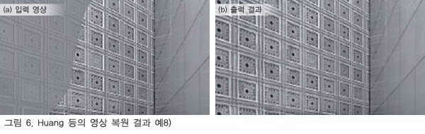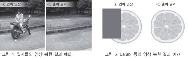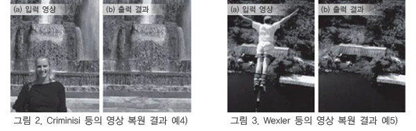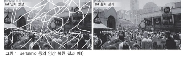 2000³â¿¡ °³ÃÖµÈ ±¹Á¦È¸ÀÇ SIGGRAPH¿¡¼­ ¡®Image Inpainting¡¯1)À̶ó´Â ³í¹®ÀÌ ¹ßÇ¥µÈ ÀÌÈÄ ¿µ»ó ¼Ó °á¼Õ¿µ¿ªÀ» º¹¿øÇÏ´Â ¿¬±¸°¡ Ȱ¹ßÇÏ°Ô ÀÌ·ç¾îÁö±â ½ÃÀÛÇß´Ù. ±×·¯³ª ±× ÀÌÀüºÎÅÍ ¿µ»ó ¼Ó °á¼ÕÀ» ÀÚ¿¬½º·´°Ô º¹¿øÇÏ´Â °ÍÀ» ¸ñÀûÀ¸·Î ÇÑ ¿¬±¸´Â ÀϺ»¿¡¼­µµ ÀÌ·ç¾îÁ® ¿Ô´Ù2) 3). ÃÖ±Ù¿¡´Â Adobe»çÀÇ Photoshop¿¡ ¡®ÄÁÅÙÃ÷¿¡ µû¸¥ ³»¿ë ÀÎ½Ä Ã¤¿ì±â(Content Aware Fill)¡¯·Î ¿µ»ó º¹¿øÀÌ ±¸ÇöµÇ°í ÀÖÀ¸¸ç ÀϹݿ¡°Ôµµ Á¡Á¡ ´õ º¸±ÞµÇ°í ÀÖ´Ù.