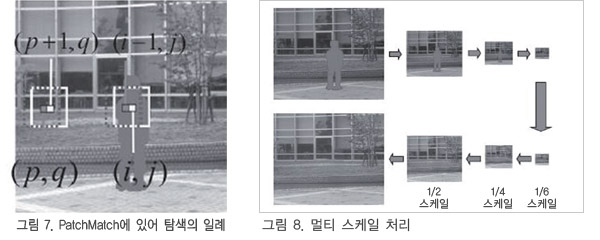 ¶Ç, ÀÎÁ¢ È­¼ÒÀÇ »ó´ëÀûÀÎ À§Ä¡°ü°è»Ó¸¸ ¾Æ´Ï¶ó ´ëμºÀ̳ª ½ºÄÉÀÏ º¯È­ µî ÅØ½ºÃ³ÀÇ ±âÇÏÇÐÀûÀÎ º¯È¯µµ °í·ÁÇÑ ÀϹÝÈ­µÈ PatchMatch10)µµ Á¦¾ÈµÅ ÀÖÀ¸¸ç ¹®Çå7)¿¡¼­ ÀÌ¿ëµÇ°í ÀÖ´Ù. ÀϹÝÀûÀ¸·Î ÅØ½ºÃ³ÀÇ ±âÇÏÇÐÀû º¯È¯À» Çã¿ëÇϸé Ž»ö°ø°£ÀÌ ¹æ´ëÇÏ°Ô ´Ã¾î³ª°Ô µÇÁö¸¸ À̰ÍÀ» ÀÌ¿ëÇÏ¸é ±× ¹®Á¦´Â ¿ÏÈ­µÈ´Ù.