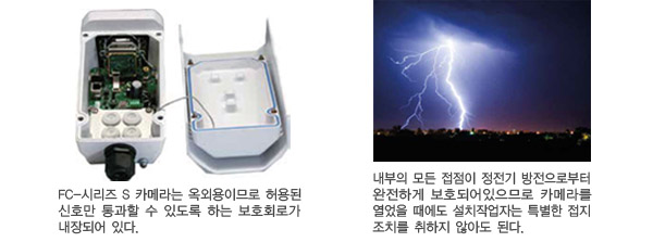 FC-½Ã¸®Áî S Ä«¸Þ¶ó´Â ¿Á¿Ü¿ëÀ̹ǷΠÇã¿ëµÈ ½ÅÈ£¸¸ Åë°úÇÒ ¼ö ÀÖµµ·Ï ÇÏ´Â º¸È£È¸·Î°¡ ³»ÀåµÇ¾î ÀÖ´Ù. ³«·ÚÀÇ À§ÇèÀº °¡´É¼ºÀÌ Èñ¹ÚÇÑ Ä«¸Þ¶ó°¡ ³«·Ú¿¡ Á÷Á¢ ¸ÂÀ» À§ÇèÀÌ ¾Æ´Ï¶ó °¡±î¿î Àå¼Ò¿¡ ¶³¾îÁö´Â ³«·Ú°¡ Àü¼±¿¡ Å« ¼­Áö Àü±â¸¦ ¹ß»ý½Ãų ¼ö Àֱ⠶§¹®ÀÌ´Ù. FC-½Ã¸®Áî S Ä«¸Þ¶ó´Â ÀÎÅÍÆäÀ̽º¿¡¼­ 4,000V ¼­Áö¸¦ ¸·À» ¼ö ÀÖÀ¸¸ç, À̰ÍÀº º¸ÅëÀÇ 1,000V º¸È£¿¡ ºñÇϸé ÈξÀ ´õ ³ôÀº °ÍÀÌ´Ù. À§Çè ¼ÒÁö°¡ ¸¹Àº Àå¼Ò¿¡¼­´Â FC-½Ã¸®Áî S Ä«¸Þ¶ó¿¡ ³»ÀåµÇ¾î ÀÖ´Â º¸È£È¸·Î¿¡ Ãß°¡ÇØ ¼³Ä¡ À§Ä¡¿¡¼­ Á¢ÁöºÀ°ú ÇǷڱ⸦ Æ÷ÇÔÇÏ¿© ÀÏÂ÷ÀûÀÎ ³«·Úº¸È£ Á¶Ä¡¸¦ ÃëÇÏ´Â °ÍÀÌ ÁÁ´Ù. ³«·Ú º¸È£Á¶Ä¡ÀÇ ¼öÁØÀº ÇØ´ç Áö¿ª/À§Ä¡ÀÇ À§ÇèÇÑ Á¤µµ¿¡ µû¶ó¼­ ´Þ¶óÁø´Ù.