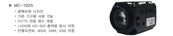 LVDS¿Í HD-SDI Ãâ·ÂÀ» µ¿½Ã Áö¿øÇϰí ÀÖ´Â MC-102A´Â HD-SDI ¹Ú½º Ä«¸Þ¶ó¿¡¼ºÎÅÍ ¹Ì´Ï IP PTZ Ä«¸Þ¶ó±îÁö ¸ðµç Á¦Ç°µé¿¡ Àû¿ëÀÌ °¡´ÉÇÏ´Ù. ±â´É»óÀ¸·Î´Â ´Ù³â°£ÀÇ ÁÜ ¸ðµâ °³¹ß·Î ½×ÀÎ ÀÚµ¿ ÃÊÁ¡°ú ÀÚµ¿ ³ëÃâÀÇ ±â¼úÀÌ ³ì¾Æ µé¾î°¡ ÀÖÀ¸¸ç, ¾È°³ º¸Á¤, ¸ð¼Ç °¨½Ã ¹× »ç»ýȰº¸È£ ±â´É µî ÀÎÅÚ¸®ÀüÆ® ±â´É°ú ¾î¶² ȯ°æ¿¡¼µµ ÃÖ»óÀÇ ÈÁúÀ» Á¦°øÇÒ ¼ö ÀÖ°Ô WDR, DNR, DSS ¶ÇÇÑ Áö¿øÇÑ´Ù.