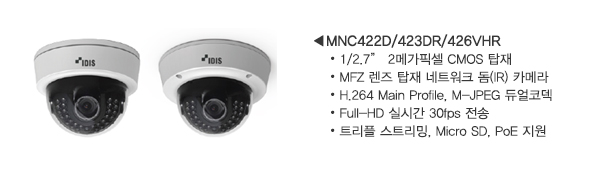 ½ÃÅ¥¸®Æ¼ ½ÃÀåÀÇ ±Û·Î¹ú ¸®´õ ¾ÆÀ̵ð½º(www.idis.co.kr)´Â VMS ¶Ç´Â NVR ´Ü¿¡¼ ÃÊÁ¡ ¹× ÁÜ Á¶ÀýÀÌ °¡´ÉÇÑ Àüµ¿°¡º¯ÃÊÁ¡ ·»Áî(MFZ)¸¦ žÀçÇÑ ³×Æ®¿öÅ© Ä«¸Þ¶ó¡®MNC422D/423DR/426VHR)¡¯¸¦ Ãâ½ÃÇÑ´Ù°í ¹àÇû´Ù.