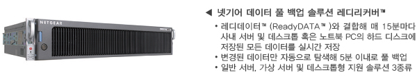 À̹ø¿¡ Ãâ½ÃÇÏ´Â ³Ý±â¾î µ¥ÀÌÅÍ Ç® ¹é¾÷ ¼Ö·ç¼Ç ·¹µð¸®Ä¿¹ö¢â(ReadyRECOVER¢â)´Â ÀÚ»çÀÇ NAS ¹× SAN ÅëÇÕ ½ºÅ丮ÁöÀÎ ·¹µðµ¥ÀÌÅÍ¢â(ReadyDATA¢â)¿Í °áÇÕÇØ »ç¿ëÇÒ ¼ö ÀÖ´Â ¹é¾÷ ¼ÒÇÁÆ®¿þ¾î ¼Ö·ç¼ÇÀ¸·Î, ¸Å 15ºÐ¸¶´Ù »ç³» ¼¹ö ¹× µ¥½ºÅ©Åé ȤÀº ³ëÆ®ºÏ PCÀÇ ÇÏµå µð½ºÅ©¿¡ ÀúÀåµÈ ¸ðµç µ¥ÀÌÅ͸¦ ½Ç½Ã°£ ÀúÀåÇÒ ¼ö ÀÖ¾î, µ¥ÀÌÅÍ ÀúÀåÀº ¹°·Ð °¢Á¾ ÀçÇØ¸¦ ´ëºñÇÑ µ¥ÀÌÅÍ º¹±¸ ¼Ö·ç¼ÇÀ¸·Î ³ôÀº Ȱ¿ëµµ¸¦ Áö´Ï°í ÀÖ´Ù.