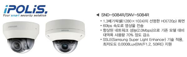µðÁöÅÐ ½ÃÅ¥¸®Æ¼ ±Û·Î¹ú ¸®´õ »ï¼ºÅ×Å©À©ÀÌ(www.samsungipolis.co.kr) 8¿ù ¼±º¸ÀÎ SND-5084R/SNV-5084RÀº 1.3¸Þ°¡Çȼ¿(1280¡¿1024)ÀÇ ¼±¸íÇÑ HD(720p) È­¸éÀ» Á¦°øÇϰí, 60fps ¼Óµµ·Î ¿µ»óÀ» Àü¼ÛÇÑ´Ù.