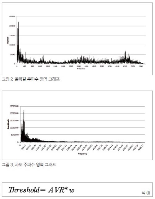 ±×¸² 2´Â °ñ¸ñ±æÀÇ Á֯ļö ¿µ¿ª ±×·¡ÇÁ, ±×¸² 3Àº Â÷µµÀÇ Á֯ļö ¿µ¿ª ±×·¡ÇÁ, ±×¸² 4´Â ¹øÈ°¡ÀÇ Á֯ļö ¿µ¿ª ±×·¡ÇÁÀÌ´Ù. °ñ¸ñ±æ, Â÷µµ, ¹øÈ°¡È¯°æµé¿¡¼ °øÅëÀûÀ¸·Î 300Hz ÀÌÇÏ¿¡¼ Å« ¿¡³ÊÁö¸¦ º¸ÀÌ´Â °ÍÀ» È®ÀÎÇÒ ¼ö ÀÖÀ¸¸ç, °ñ¸ñ±æ ȯ°æÀº ÁÖ·Î »ç¶÷µéÀÌ Áö³ª´Ù´Ï´Â ¹ßÀÚ±¹ ¼Ò¸®, ¹Ù¶÷ ¼Ò¸®ÀÌ´Ù. Â÷µµ ȯ°æÀº ÁÖ·Î Â÷°¡ Áö³ª°¡´Â ¼Ò¸®, °æÀû¼Ò¸®ÀÌ¸ç ºñ¸í°ú È¥µ¿Çϱ⠽¬¿ï ¼ö ÀÖ´Â °æÀû¼Ò¸®´Â 2500Hz ºÎ±Ù¿¡¼ Å« ¿¡³ÊÁö°¡ ¹ß»ý ÇÑ´Ù. ¹øÈ°¡ ȯ°æÀº ÁÖ·Î »ç¶÷µéÀÇ ¸»¼Ò¸®¿Í ³ë·¡ ¼Ò¸®À̸ç, 2000HzºÎ±Ù¿¡¼ Å« ¿¡³ÊÁö¸¦ º¸ÀδÙ.
